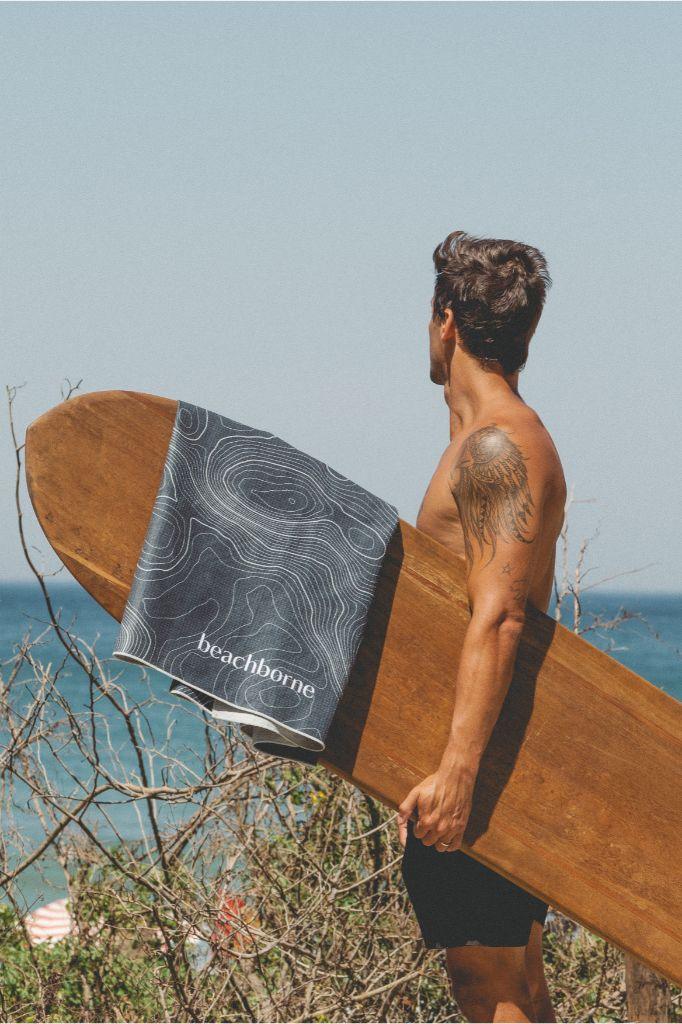 The Beachborne beach towel is sand free, super absorbent, quick dry, compact and lightweight. Perfect for your local beach days and overseas travel. Consciously crafted with our premium high performance GRS-certified recycled fabric. Designed in Australia to be beautiful, functional, eco friendly, and to reduce unnecessary manufacturing, water and packaging waste.